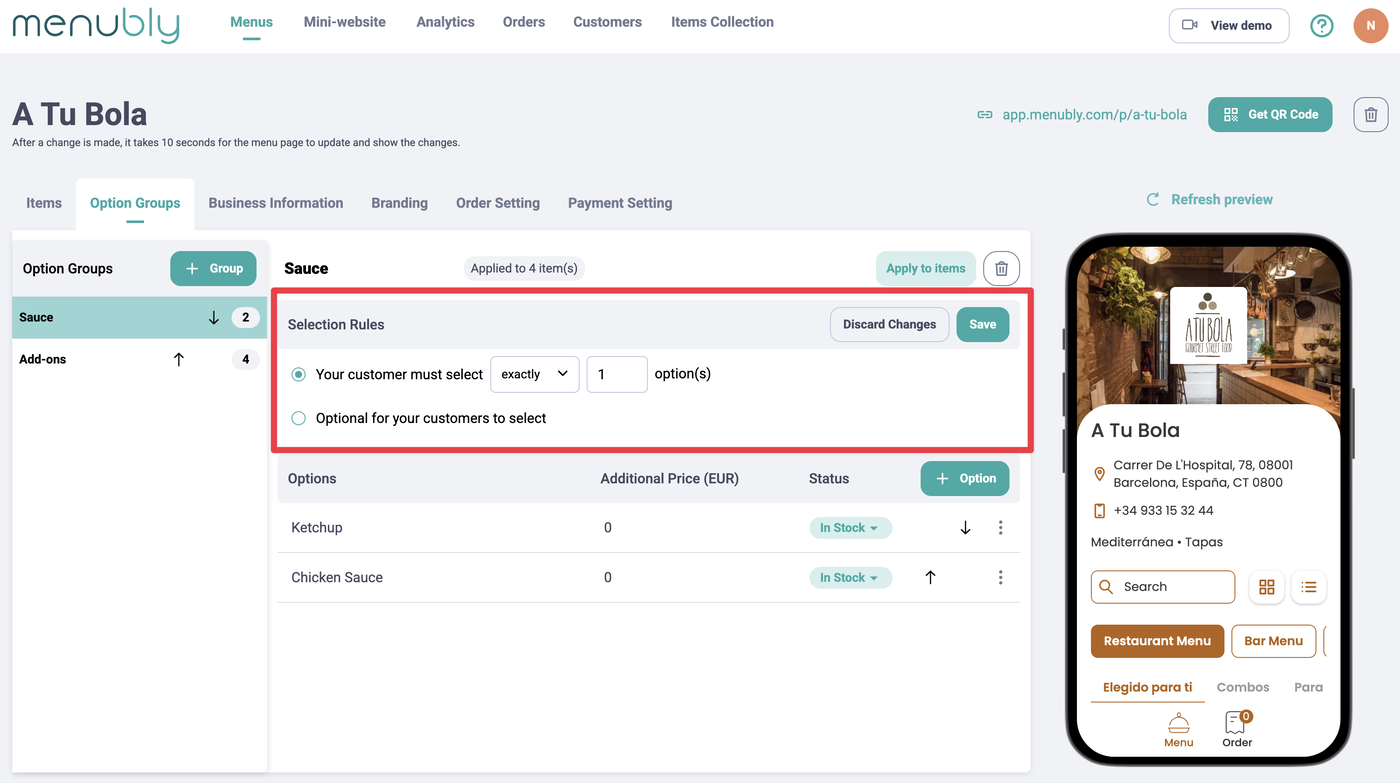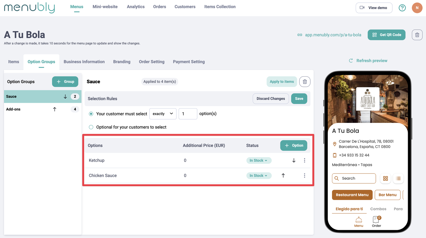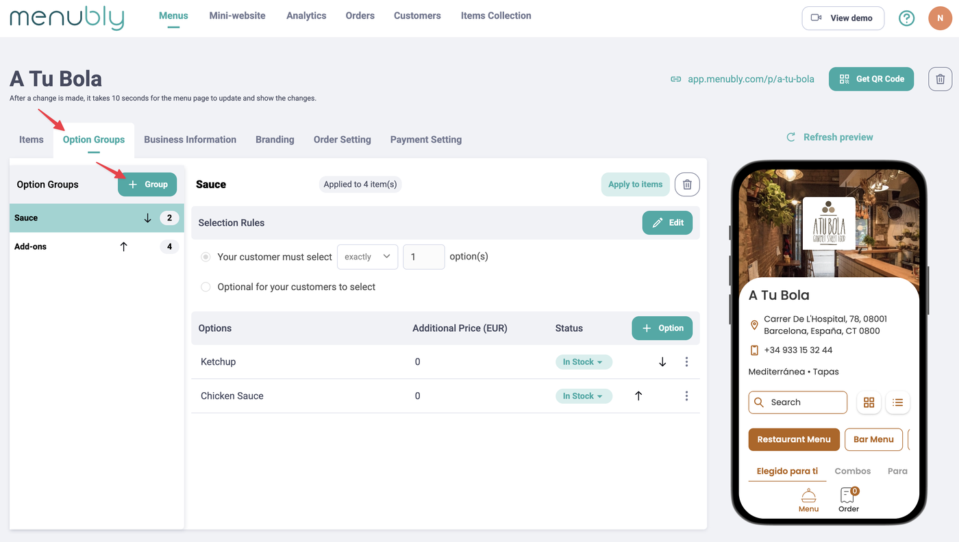 Option groups don't show on the main menu page. They appear when a customer taps on an item and adds it to the cart — that's when they'll see the options to choose from.
