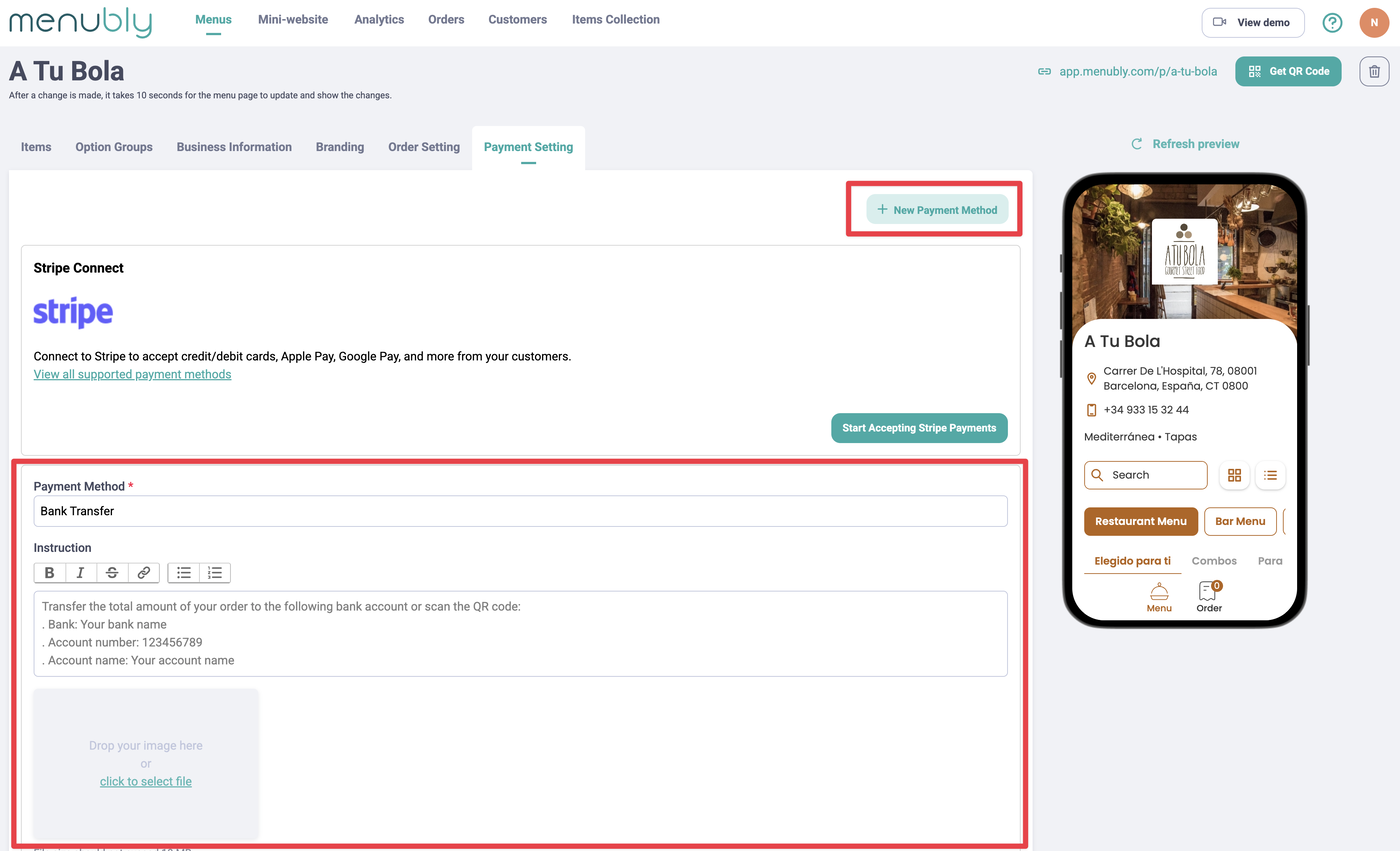 Menubly gives you two ways to collect payment from your customers: Manual Payment Collection (cash on delivery, bank transfer, etc.) and Online Payment Collection with Stripe (credit card, Apple Pay, Google Pay, and more). This guide explains how each method works so you can choose the best fit for your restaurant.