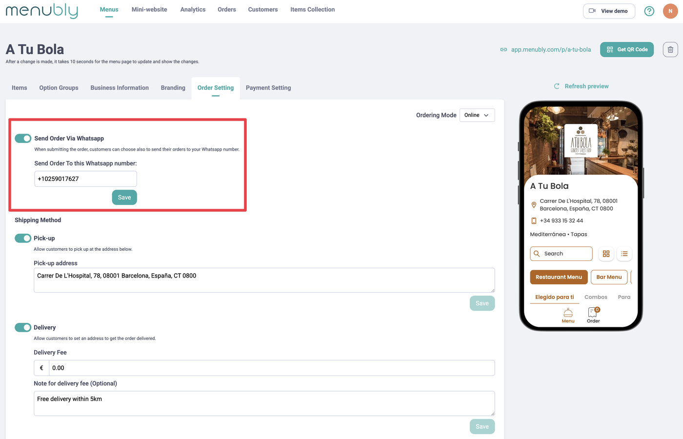 Go to Order Setting and update the WhatsApp number field